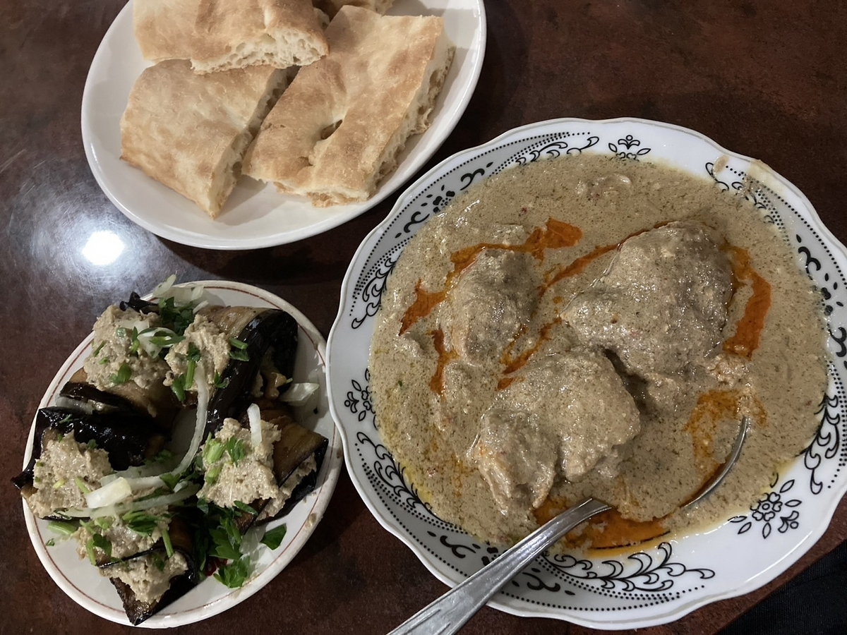 ↓バドリジャーニ(=ナスにたっぷりのクルミペーストを巻いたやつ)と、チキンハルチョー(=砕いたクルミが入ったスープ)無意識にクルミコラボをしてしまった。美味しいが一人ではちょっともったり重い。