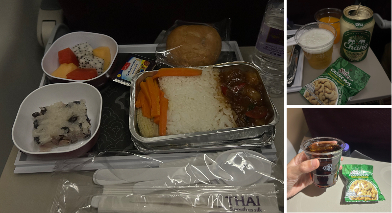 再々出発後はLCCばかりだったので、久しぶりの機内食とビールにテンションが上がる!(タイ国際航空)